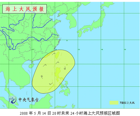 5月14日下午2时,渤海、黄海大部海域出现了4-5级西南风或偏南风;东海大部海域出现了4-6级东北风;台湾海峡、台湾以东洋面和以南海域、南海北部和中部海域以及菲律宾以东洋面出现了6-8级东北风;南海南部海域出现了6-7级西南或偏西风。东海西部海域、南海西北部海域、泰国湾北部海域、安达曼海、马六甲海峡、苏门答腊以西洋面、巽他海峡、马古鲁海以及班达海等海域的能见度不足10公里。其他海域能见度及天气海况条件较好。