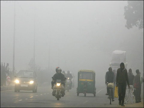 12月29日,在印度首都新德里,人们在大雾中穿行。