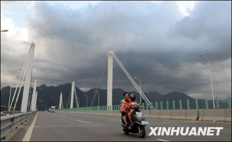 7月17日,福州市民经过乌云笼罩的大桥(来源:新华网)