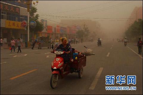 6月27日,一名商户在沙尘中骑行。新华社发(李军 摄)