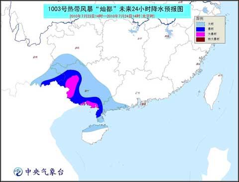 受“灿都”和西南季风共同影响,23日中午到24日中午,北部湾、广东西部近海及沿海、广西沿海仍将有6-7级大风,阵风可达8-9级;广东西南部、广西中西部和南部、海南北部、云南东南部、贵州西南部等地有大雨或暴雨,其中,广西东南部和西南部的局部有大暴雨。