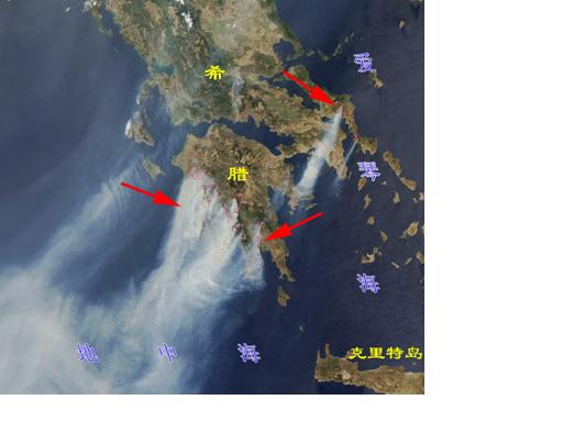 图为我国气象卫星希腊火情监测图(2007年8月26日)